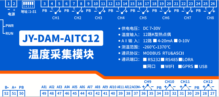 热电偶输入12(CH12) | 34 | PB | 热电偶传感器屏蔽线接口 |