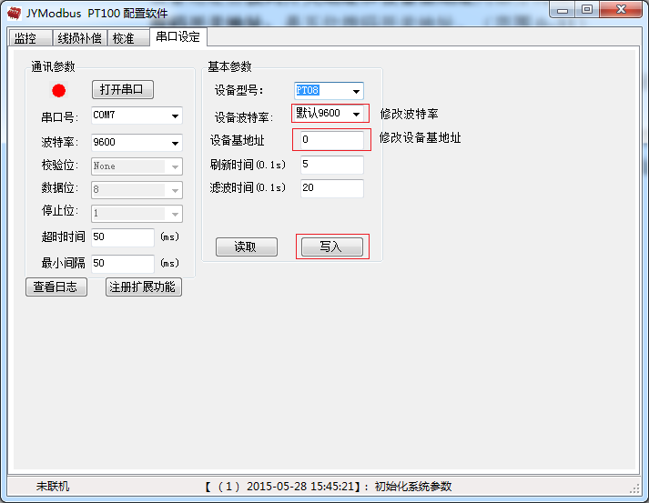确定通信成功后,在基本参数中选择正确的波特率和需要配置的设备地址,点击写入,若是下边信息栏种显示写入成功,则说明操作成功,可以点击读取,确定操作结果。