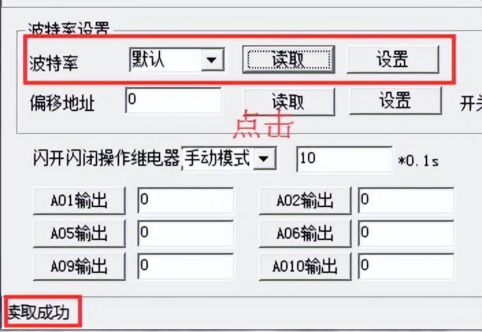 确定通信成功后,在基本参数中选择正确的波特率和需要配置的设备地址,点击写入,若是下边信息栏种显示写入成功,则说明操作成功,可以点击读取,确定操作结果。
