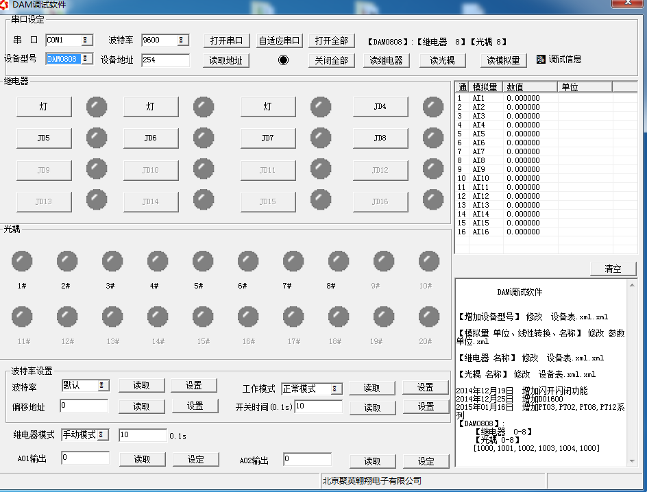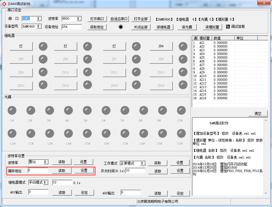 打开“聚英翱翔DAM调试软件”;串口设定栏:串口选择您电脑对应COM口,波特率选择设备默认波特率(9600)(未自己设置过波特率前),设备地址填写“254”(254为设备的广播地址),设备型号选择相对应型号,设置好以上设备的4个参数后点击打开串口,点击继电器按钮“JD1”若继电器反应则连接成功。