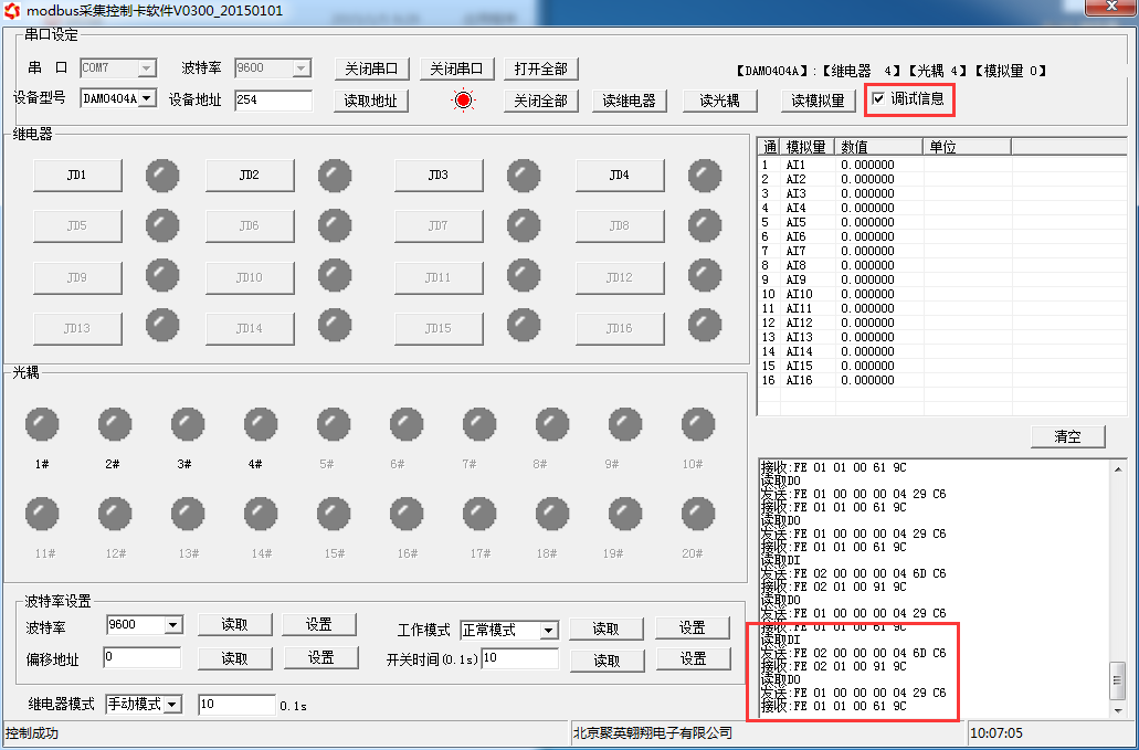 DAM调试软件查询速率为3s,接入输入信号后,可通过点击读取光耦或读取模拟量来立刻查看输入状态及数据。