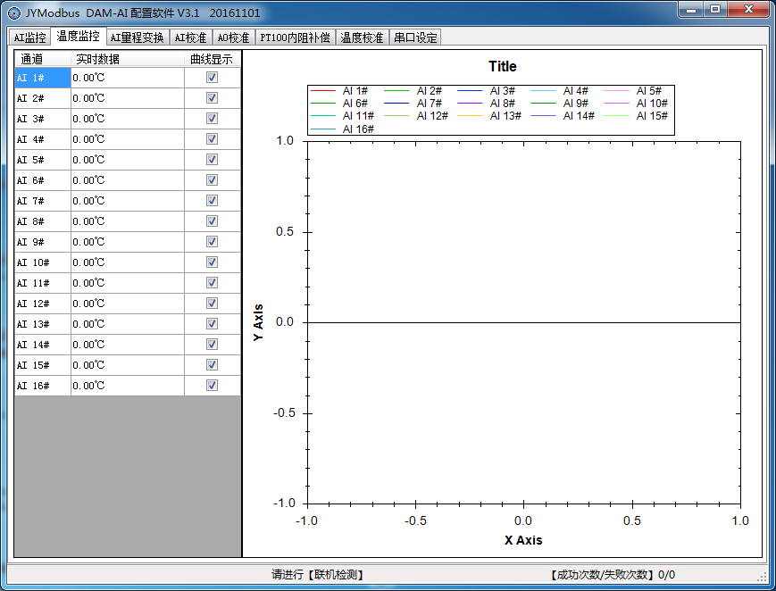 打开采集配置软件,选择串口设定菜单,在通讯参数中点击关闭串口,选择相应的串口号和波特率(默认9600),超时时间最小间隔都改成50ms?;静问?strong>设备型号选择PT08。点击打开串口 ,点击 读取 按钮,在下边信息栏中显示读取成功,则表示联机成功,(若显示通信失败,请确定串口接线,串口号,波特率和地址是否正确)。