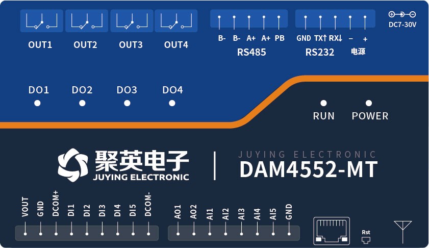 DAM4552-MT 工业级云系列网络版 4路继电器输出(DO)5路开关量采集(DI)5路模拟量采集(AI)2路模拟量输出(A0),4路继电器控制输出,触点隔离;5路开关量输入(NPN/干接点);5路模拟量(4-20mA、0-5V、0-10V)输入;2路模拟量...
