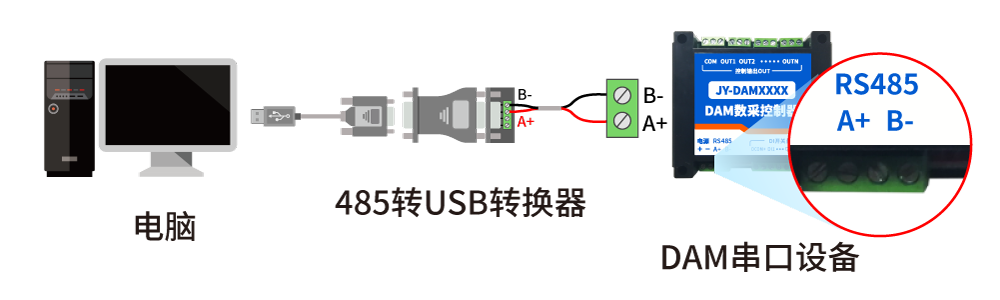 电脑自带的串口一般是RS232,需要配232-485转换器(工业环境建议使用有源带隔离的转换器),转换后RS485为A、B两线,A接板上A端子,B接板上B端子,485屏蔽可以接GND。若设备比较多建议采用双绞屏蔽线,采用链型网络结构。