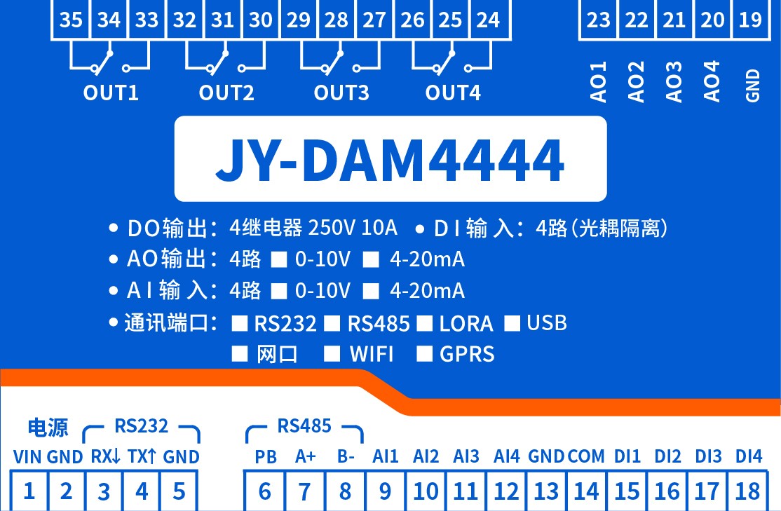 工业级继电器控制板 4路继电器控制(DO)4路光耦输入(DI)4路模拟量输入(AI)4路模拟量输出(AO),4路继电器控制输出;4路光耦输入(5-24V) ;4路12位分辨率模拟量电压输入;4路12位分辨率模拟量隔离输出;支持RS232或隔离RS485通讯接...