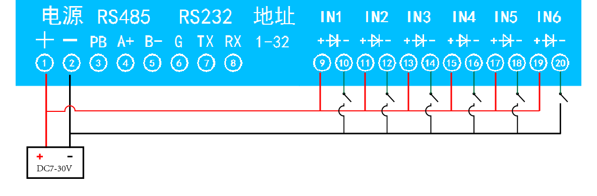 • 可以设置0-255个设备地址,5位地址拨码开关可以设置1-31地址码,大于31的可以通过软件设置;