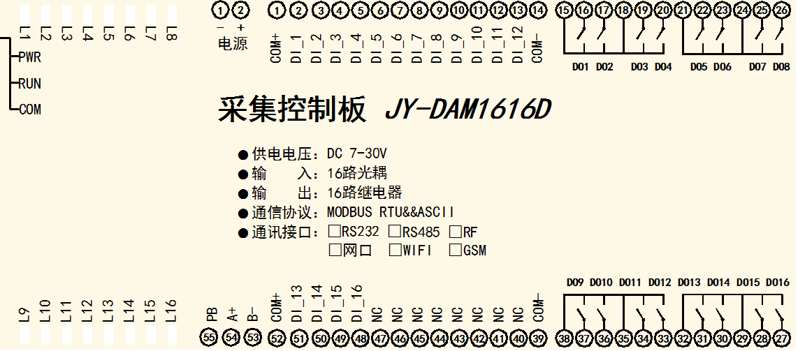 • 十六路路光耦隔离输入,可以接无源触点和DC3.3-24V电压;