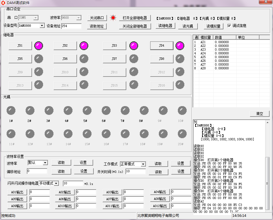 3. 设备地址修改为254,点击“读取地址”,软件底部提示“读取成功”,读到的设备地址为“0”,软件右下方的发送和指令正确,则说明设备与电脑通讯成功。