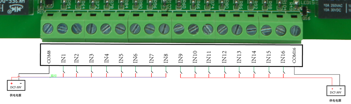 2、有源开关量(光耦)接线示意图(PNP型高电平有效输入)