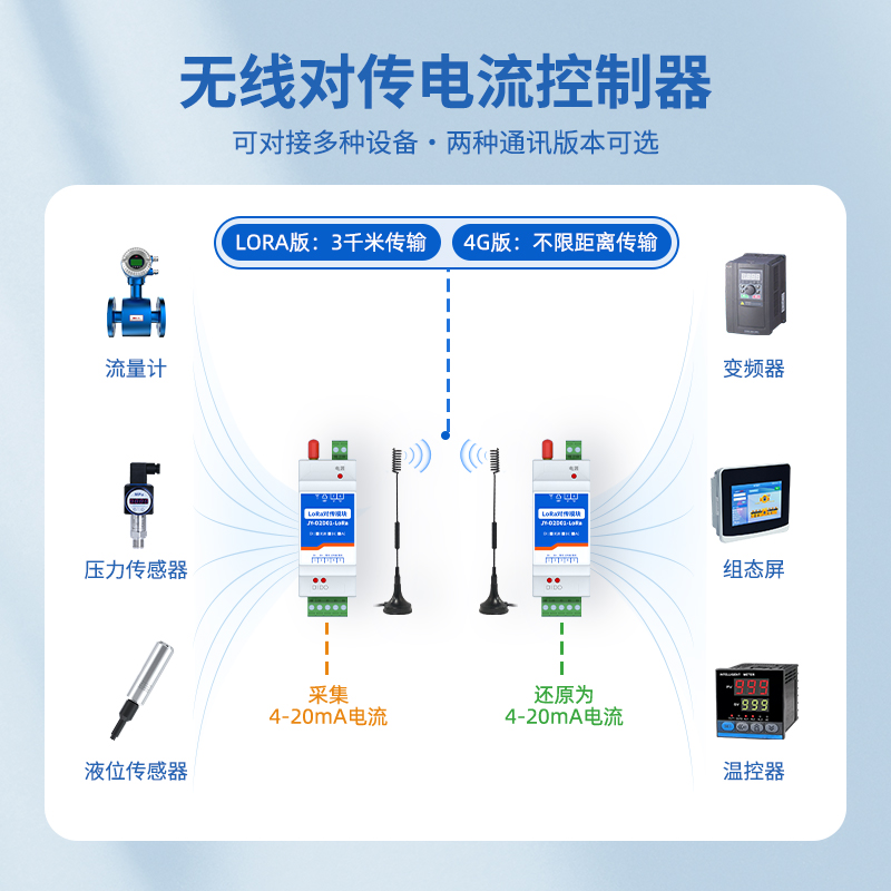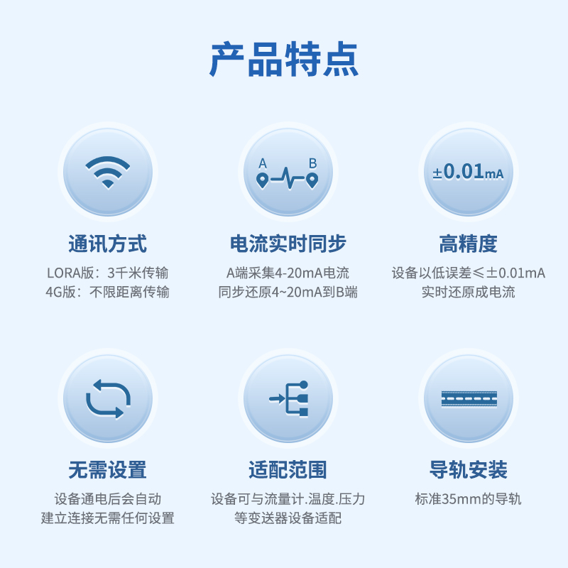模拟量对传模块通过LoRa/4G技术进行通信,信号传输稳定可靠,不易受到外部干扰,无需设置设备通电后会自动建立连接,电流实时同步,设备可与流量计、温度、压力等变送器设备适配,设备精度高,误差低于0.01mA,支持标准35mm导轨安装。