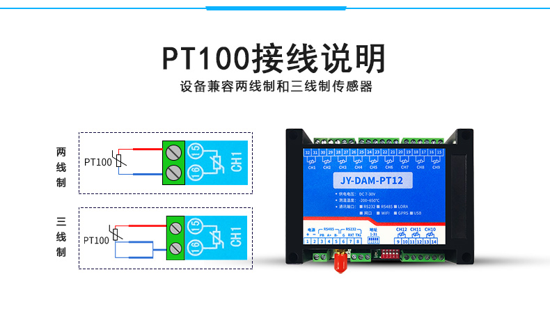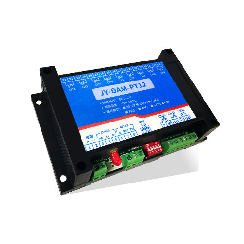 12路PT100温度数据采集DAM-PT12 工业级温度采集??椋呔?4位AD转换分辨率0.01●测温精度0.1℃●采集频率10HZ,●支持多路同时采集●设备兼容两线制和三线制PT100传感器,应用于水温、环境、路面、电缆等温度采集场景