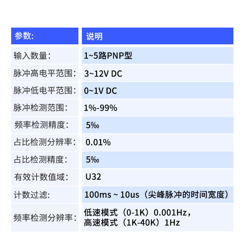 高速脉冲计数采集???,支持1-5路脉冲输入采集,0.1HZ~40KHZ脉冲输入检测,还支持频率、占比、周期监测,可以正交、脉宽过滤计数,并且支持掉电记忆存储。