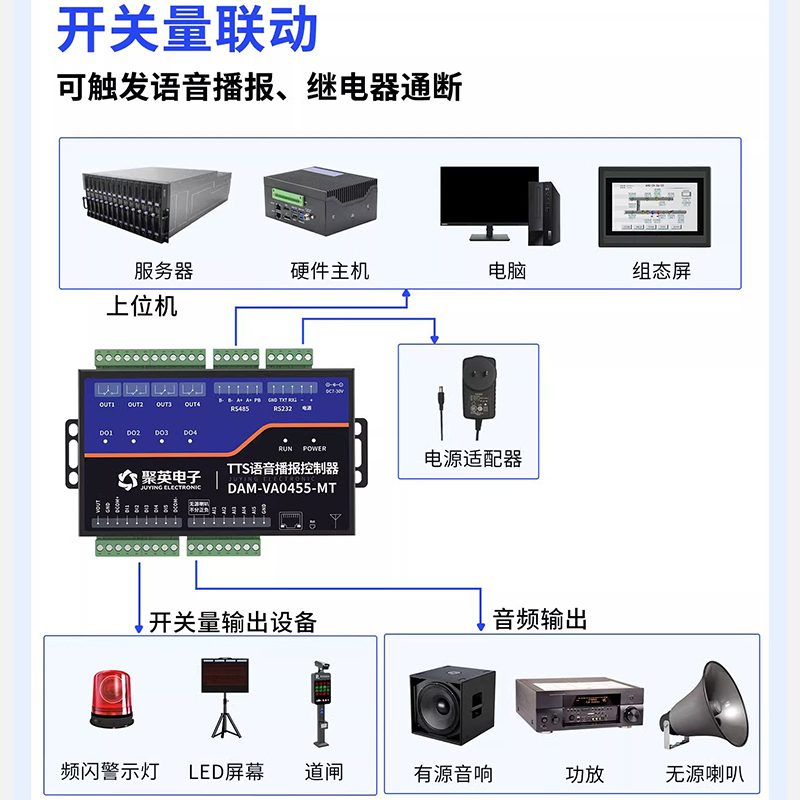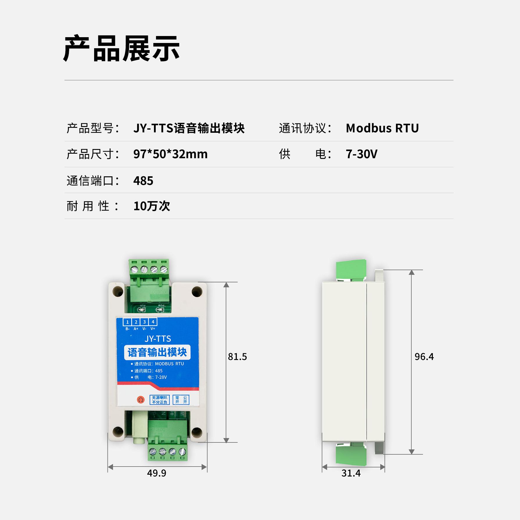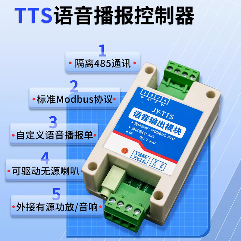 JY485-TTS ??槭且豢罡咝阅艿奈谋居镆艉铣赡??,集成了485 通讯接 口,遵循Modbus 通信协议,该??橹С指鲂曰渲?,包括单条语音的音量、音色及语速调整,满足多样化的应用场景需求。同时能够同时保存多条语音信息。此外, JY485-TTS ??椴捎眯槟?Do 触发机制,进一步提升了操作的便捷性和响应速度。