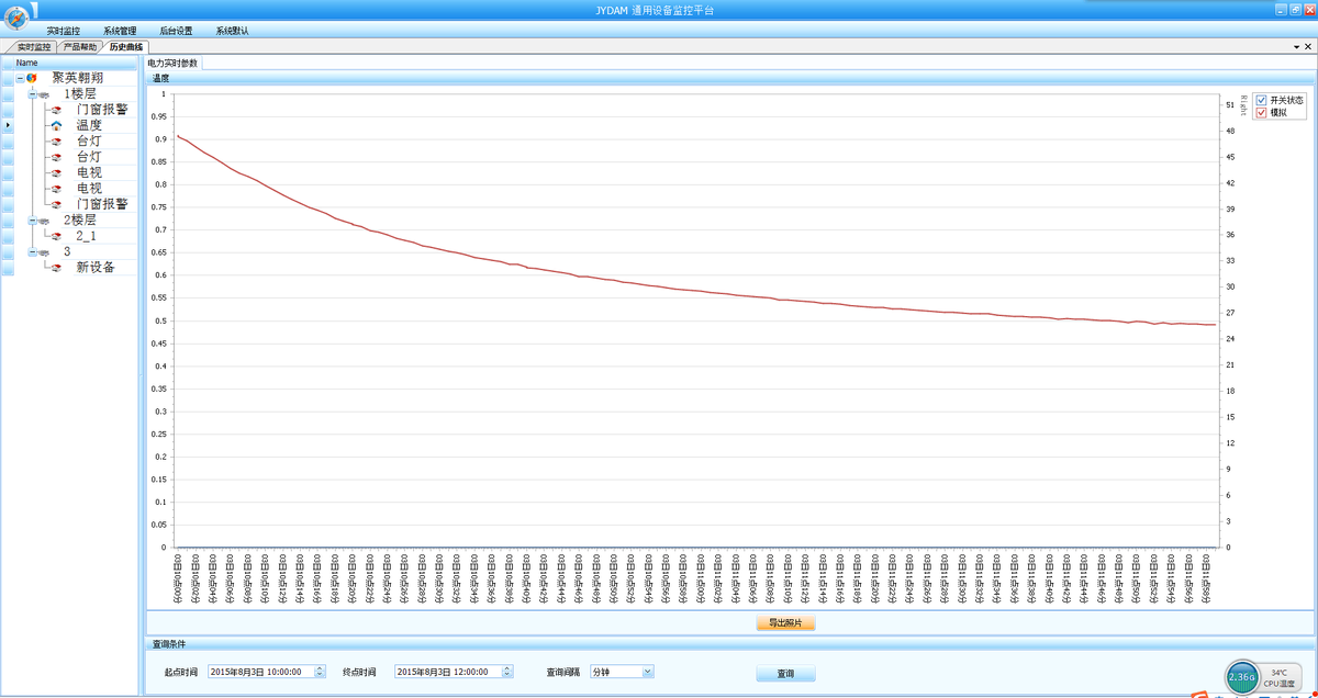 聚英组态软件可监控菜单下可以实时监控每路的温度及变化曲线,并可导出历史数据和历史曲线记录。