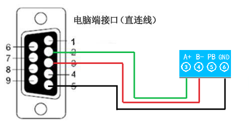 电脑自带的串口一般是RS232,需要配232-485转换器(工业环境建议使用有源带隔离的转换器),转换后RS485为A、B两线,A接板上A端子,B接板上B端子,485屏蔽可以接GND。若设备比较多建议采用双绞屏蔽线,采用链型网络结构。