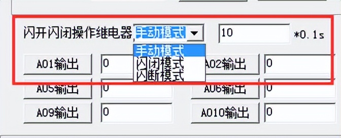 打开“聚英翱翔DAM调试软件”点击继电器模式后面下拉箭头进行模式的选择。(后边时间可自行设置,实际时间=填写数字*0.1【单位秒】)